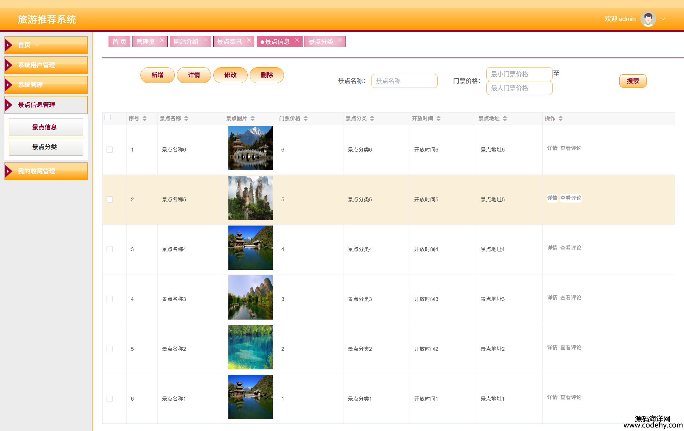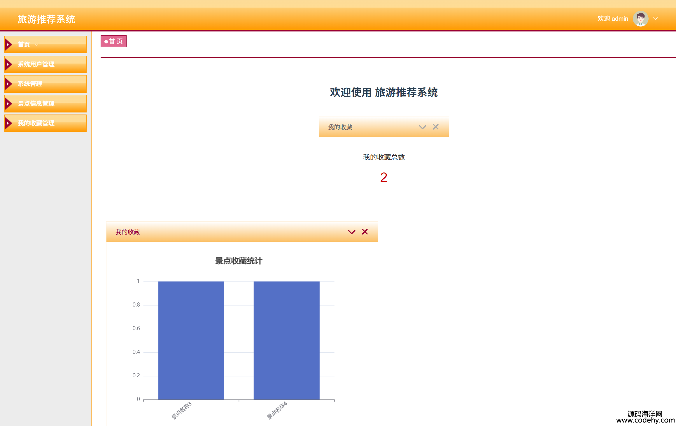 首頁、系統用戶管理、系統管理、景點咨詢、景點管理、景點分類、景點信息、我的收藏管理等